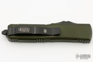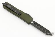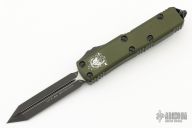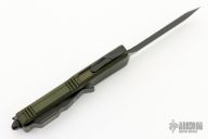 This UTX-85 OTF automatic by Microtech features a black double edged "Spartan" M390 blade. The handle has a green aluminum frame with all black hardware, tip down black stainless steel clip. Serial number 0137 and dated 09/2018. Comes with original box and papers. Excellent condition.