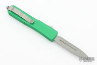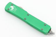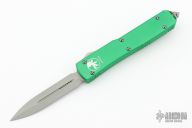 This Ultratech OTF automatic by Microtech features a D/E dagger blade with fullers. Green aluminum frame with blasted hardware and tip down stainless steel clip. Dated 09/2012. From the USN 2012 show. Excellent condition.