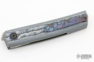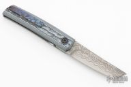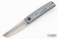 This Tachi OS Front Flipper by Jared Oeser features a Damacore tanto blade with false top edge. The handle has white/black CarboQuartz scales, black Timascus pivot collars, and backspacer. Bead blast finish titanium liners, and black Timascus tip up pocket clip. Darkened hardware. Nice detent, lockup and blade seating. Comes with original box, COA dated June 26, 2023 and hank. Excellent condition.