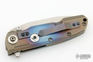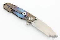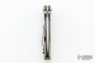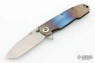 This Frame lock Flipper by District 9 has a stonewashed S35VN clip/ spear point blade with dual thumb studs, flipper, and filed thumb rest. Handle is stonewashed and anodized titanium with stainless steel lock bar insert, manual lock safe system (preventing the lock bar from sliding to the open position, making this knife a virtual fixed blade), stonewashed titanium backspacer and tip up clip, and lanyard hole. This is an impressive piece with superb ergonomics and mechanics. Flips like a champ on caged bearings, dead center blade seating and rock solid lockup. Very nice work. Excellent condition.