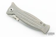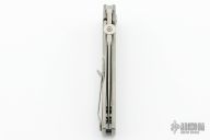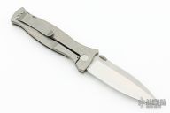 This MK3 by Les George features a satin finished blade with false top edge and knurled thumbdisc. The handle has a stonewashed titanium frame with 3 milled fullers and a titanium tip up clip. Nice detent, lockup and blade seating. Comes with a zippered case. New condition.