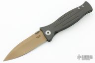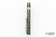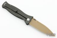 This MK3 by Les George features a FDE DLC blade with false top edge and knurled thumbdisc. The handle has a black DLC titanium frame with 3 milled fullers and a titanium tip up clip. Nice detent, lockup and blade seating. Comes with a zippered case. New condition.