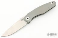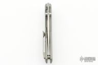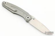 This Knife features a stonewashed blade with dual thumbstuds and a notched thumbrest. The handle features a tumbled titanium frame with a matching tip up pocket clip. Includes a padded zippered case and COA. S/N 191. Excellent Condition.