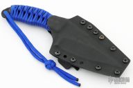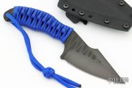 This SB-1 from Borka Blade features a DLC clip point blade with a multigrind and stonewash finish, false top edge, .215" blade stock and 1.538" blade depth. The handle is comprised of blue paracord wrap over on slip inserts and full tang construction. Includes kydex sheath with horizontal clip. Comes with zipper case. Excellent condition.