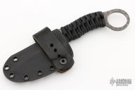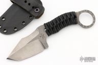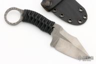 This Karambit from Borka Blade features a stonewash finish tanto blade with false top edge, .223" blade stock and 1.529" blade depth. The handle is comprised of black paracord wrap over on slip inserts and full tang construction. 1.10" diameter ring. Includes kydex sheath with leather loop. Excellent condition.