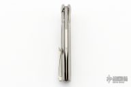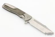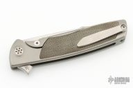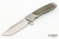 This Evo Typhoon from Brian Nadeau features a satin finished blade with a fuller and thumbrest. The handle is comprised of a bead blasted titanium frame with green canvas micarta inlays, satin titanium tip up clip. Rides on bearings, nice detent, lockup and blade seating, stainless lockface insert. Has some light scuffs, otherwise excellent condition.
