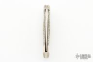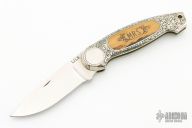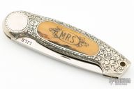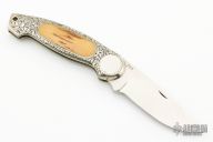 This Button Lock Folder from Jimmy Lile features a satin finished blade with nail nick, #286 on blade. The handle has an engraved nickel silver frame with scrimshawed stag inlays. Engraved and scrimshawed by James Stewart. Large button lock release mechanism used to open and close the knife. Numbered "80" on inside of backspacer. Has some small dings and scratches, otherwise excellent condition.