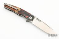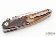 This knife by Ikigai Knives features a satin finished blade with notched thumbrest. The handle has wood/resin scales, titanium liners, backspacer and tip up clip. Nice detent, lockup and blade seating. Has a few light scuffs, otherwise excellent condition.