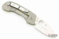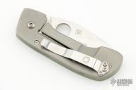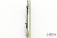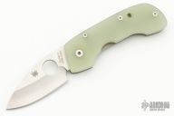This Leafstorm by Spyderco is a Kevin Wilkins design, it features a satin finished blade with thumbhole and notched thumbrest. The handle has a Jade G-10 front scale and backspacer and a titanium lockside with tip up stainless steel clip. Excellent condition. Blade reads "Pilot 50 Pieces"