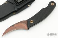 This Elvia by Turner CNC features an HT Oxide finish blade, .158" blade stock and 1.080" blade depth with full tang construction. The handle has a milled black g10 scales. Comes with a kydex sheath and the knife will fit in either direction, original box, and COA. 60HRC with Cryo. Excellent condition.