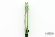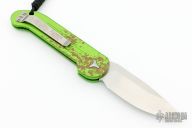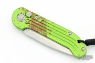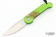 This LUDT side opening automatic by Microtech has a stonewash finished blade with a standard edge and a contoured green aluminum frame. Stainless steel clip. Serial number 015. Comes with original box and papers. New condition.