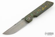 This framelock flipper by Billy Cho Knives features a dark rub finished blade with a notched thumbrest and flipper. The handle has a Toxic Fat Carbon scale, bead blast finish frame, with matching tip up clip and carbon fiber backspacer. Nice detent, lockup and blade seating, rides on phosphor bronze washers. Comes with COA dated 04/2024. Has a couple spots of minor oxidation on the blade and pivot, otherwise excellent condition.