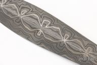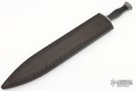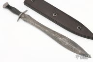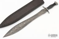 This Hainz Sword by Phillip Patton features a Damascus double edged wasp waist blade with .235" blade stock and 2.235" blade depth, hidden tang construction. The handle has a Damascus guard and butt with a black canvas micarta grip. Includes a hand tooled black leather sheath. Excellent Condition.