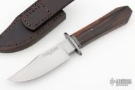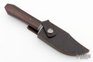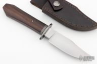 This Bowie by Ray Laconico has a hand rub satin finished clip point blade with false top edge and hidden tang construction, .258" blade stock, 1.277" depth. Handle is cocobolo with a blued steel double guard and a single domed pin. Comes with a black leather sheath with belt loop. Excellent condition.
