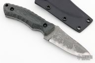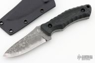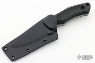 This Shinobazu by Kiku Matsuda features a drop point blade with false top edge and notched thumbrest, .199" blade stock and 1.416" blade depth, full tang construction. The handle has black G-10 scales, lanyard hole. Comes with a kydex sheath. Excellent condition.