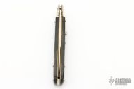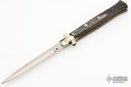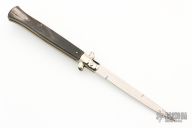 This 11" Swivel Bolster by Frank Beltrame features a mirror polished bayonet ground blade with false top edge. The handle has stainless steel bolsters, buffalo horn scales, brass liners and stainless steel spring. Excellent condition.