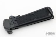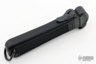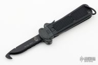 This Gravity knife by Eickhorn Solingen features a black partially serrated chisel ground blade with hook blade at the tip. Blade deploys with gravity. The handle is black plastic with lanyard bail. Excellent condition. Comes with some info, but its in German.