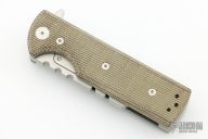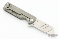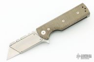 The CHUB (Chaves Handy Utility Blade) Flipper from Ramon Chaves features a replaceable utility blade. The handle has a green micarta scale, stonewashed titanium frame and a reversible titanium skull pocket clip. Has some light scratches, otherwise excellent condition.