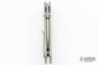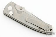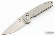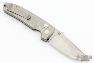 This Project VECP Buttonlock from Les George features a stonewashed CNC flat ground blade and a tumble finish titanium frame. Tip up titanium clip. Phosphorus bronze washers. Smooth action. Nice blade seating, detent and lockup. Excellent condition.