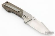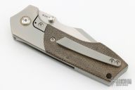 This knife was designed by Michael Burch and produced by Reate Knives.  The knife features a satin finished blade with dual thumb studs and a notched thumb rest.  The handle features bead blasted bolsters, liners and a matching tip up pocket clip.  The scales are green canvas micarta. Nice detent, lock up and blade seating. Has a few scuffs and scratches, great condition otherwise.