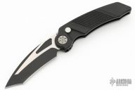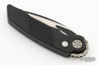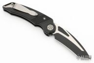 This MRX by Rat Worx features a black tanto recurve blade with satin flats. The handle is black aluminum with a chain drive opening mechanism. Tip up blasted stainless clip. Has a couple light scuffs, otherwise Excellent condition.