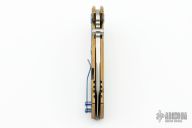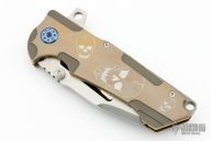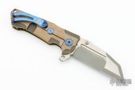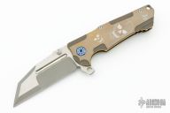 This Butcher by Andre De Villiers features a two tone, compound ground wharncliffe style blade swedge, fullers notched thumb rest, dual thumb studs and flipper. The handle is comprised of two tone machined and anodized titanium with matching tip up clip over a tumbled and notched titanium backspacer. Lanyard hole in pommel. Great blade seating, detent and lock up.  Includes a padded zippered case.  Excellent Condition.