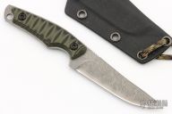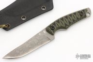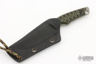 This Neck Knife by Kiku Matsuda features an acid etched blade with false top edge with notched thumbrest, .103" blade thickness and .945" blade depth, full tang construction. The handle has black/green G-10 scales. Comes with kydex sheath. Excellent condition.