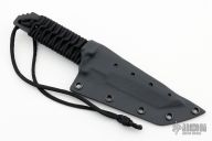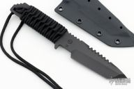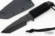 This HT by Strider Knives features a black tanto blade with false top edge and notched thumbrest, ..177" blade stock and 1.265" blade depth, full tang construction. The handle has black cord wrapped grip. Comes with a kydex sheath. Excellent condition.