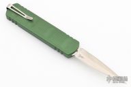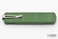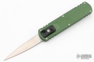 This Zulu Spear by Darriel Caston features a satin finished double edged blade. The handle has a green aluminum frame with stainless hardware and clip. Black push button. Comes with original box. New from maker.