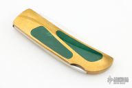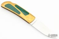 This Interframe Lockback by John LeBlanc features a mirror polished blade with nail nick. The handle has a brass frame with jade inserts. Nice seating and lockup. Has some light patina, otherwise excellent condition.