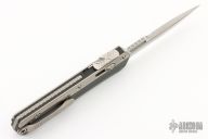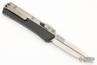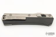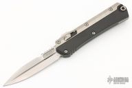 This Glykon by Microtech features a stonewashed double edged blade with fullers and notched thumbrest. The handle has a black aluminum chassis with bead blasted titanium overlays and tip down clip. Comes with original box and papers. Dated 01/2023 and #271.   Excellent condition.