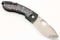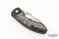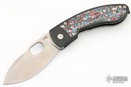 This Lumm Leaf by Darriel Caston has a stonewash finish drop point blade with thumbhole and swedge. The handle features a black frame with red/blue/black carbon inlays. Tip up clip deep carry. Comes with original box. New from maker.