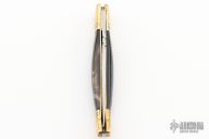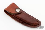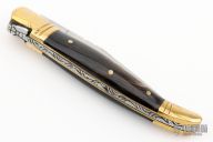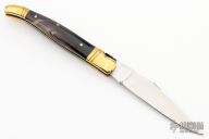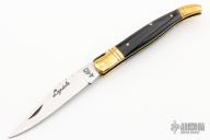 This knife by Laguiole features a satin finished clip point blade with a nail nick and fileworked spine.  The handle features brass bolsters/liners over a fileworked steel backspring and buffalo horn covers. Comes with original brown leather sheath. Has a few light scratches, otherwise excellent condition.