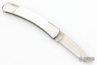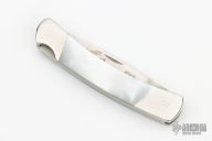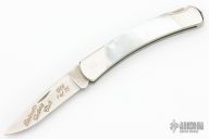 This Model 501 Duke by Buck has a satin finished drop point blade with nail nick. The handle has a stainless steel frame, mother of pearl scales and a stainless steel backspacer. Excellent condition.