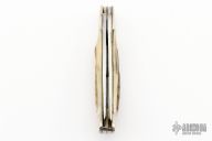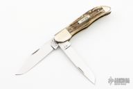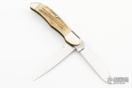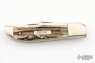 This Bob Cat Trapper by Neal Monticello features a mirror polished blades with nail nicks. The handle has nickel silver bolsters, stag covers, brass liners and steel springs. Has some light scratches and patina, otherwise good condition.