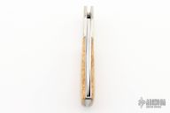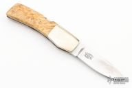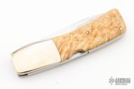 This Lockback by TD Bennett features a mirror polished blade with nail nick. The handle has dovetailed nickel silver bolsters, maple burl scales, stainless steel liners and backspacer. Has a couple light scratches, otherwise excellent condition.
