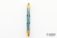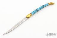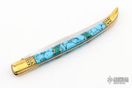 This Slipjoint by Fury features a satin finished blade. The handle has brass bolsters, turquoise covers, brass liners and a steel spring. Has some light scratches, otherwise good condition.