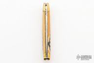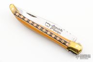 This Slipjoint by Laguiole features a mirror finished clip point blade with a nail nick and a fileworked spine.  The handle features brass bolsters, brass liners, fileworked stainless steel backspring, fancy wood covers. Has a few light scratches, otherwise excellent condition.