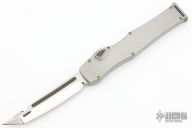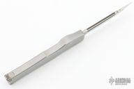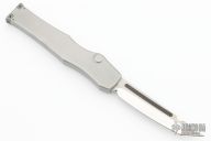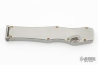 This Marfione custom Halo VI has a mirror polished tanto blade with lightning strike carbon fiber inlays. The handle is made from double vapor blasted stainless steel with bronzed titanium hardware, and has no integrated safety on the push button, push button has lightning strike carbon fiber inlay. The charging handle comes marked with the Marfione Dagger and dated 11/2020. Has lightning strike carbon fiber inlay in the charging handle and button. Comes with original box, zippered case and COA. Excellent condition. Microtech's Halo VI sets itself apart from previous models with added features and an improved charging handle mechanism. Its upgraded charging handle is built with dual pivoting latches that create a secure seal in the closed position. Dated 11/2020 and s/n 011.