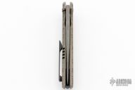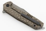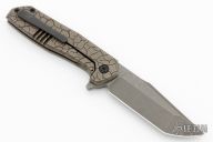 This Ragnarok V1 by Nick Chuprin features an acid-wash blade and flipper.  The handle has a laser engraved titanium frame with blackened titanium hardware and tip up pocket clip. Blackened titanium floating backspacer.  Nice detent, lockup and blade seating. Comes with a zippered case and COA. S/N 37. New from maker.