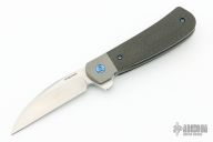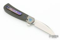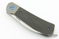This Swayback flipper from Enrique Pena features a hand rub satin finished wharncliffe blade with notched flipper. The handle has a bead blasted titanium frame with carbon fiber scales, anodized titanium hardware and backspacer, and a tip mokuti clip. This knife flips well with no wrist action needed. Blade is centered when closed and locks up with no blade play. Comes in an embroidered/padded case. Excellent condition.