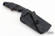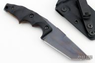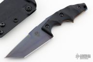 This POGN-L by Bawidamann Blades features an acid etched patina finished blade with a sharpened top edge, notched thumbrest, .151" blade stock and 1.545" blade depth, full tang construction. The handle has black G-10 scales. Comes with a kydex sheath. New from maker!