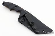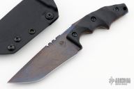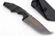 This POGN-XL by Bawidamann Blades features an acid etched patina finished Muninn Slicer blade with a false top edge, notched thumbrest, .163" blade stock and 1.545" blade depth, full tang construction. The handle has black G-10 scales. Comes with a kydex sheath. New from maker!