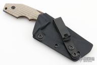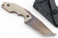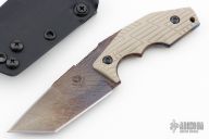 This POGN fixed blade from Bawidamann Blades has an Acid Etched Patina finished blade with notched thumbrest and sharpened top edge, .165" blade stock and 1.451" blade depth, full tang construction. The handle features tan G-10 grips by VZ Grips. Comes with kydex sheath. New from maker!