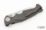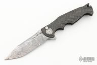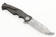 This Tighe Breaker Integral Flipper by Brian Tighe features a Damasteel blade with dual thumb studs, notched thumbrest and a flipper. The handle has a milled, marbled carbon fiber frame with deep finger grooves, Damasteel pivot collars and darkened tip up clip, lanyard hole at the butt. Smooth flipper action. Nice blade seating and lockup. Excellent work. Comes with a nylon zippered case. New from maker!