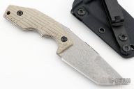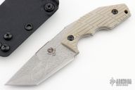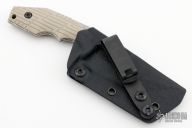 This POGN fixed blade from Bawidamann Blades has an Acid Etched Silver finished blade with notched thumbrest and sharpened top edge, .165" blade stock and 1.451" blade depth, full tang construction. The handle features tan G-10 grips by VZ Grips. Comes with kydex sheath. New from maker!