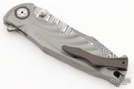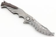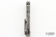 This Tighe Breaker Integral Flipper by Brian Tighe features a San-Mai Damascus blade with dual thumb studs, notched thumbrest and a flipper. The handle has a milled and bead blasted integral titanium frame with deep finger grooves, Zirconium pivot collars and tip up clip, lanyard hole at the butt. Smooth flipper action. Nice blade seating and lockup. Comes with zipper case. New from maker!