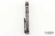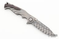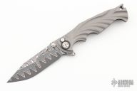 This Tighe Breaker Integral Flipper by Brian Tighe features a San-Mai Damascus blade with dual thumb studs, notched thumbrest and a flipper. The handle has a milled and bead blasted integral titanium frame with deep finger grooves, Zirconium pivot collars and tip up clip, lanyard hole at the butt. Smooth flipper action. Nice blade seating and lockup. Comes with zipper case. New from maker!