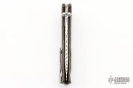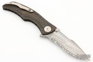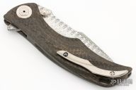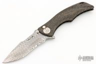 This Tighe Down Button Lock Flipper by Brian Tighe features a Damasteel multi-ground blade with notched thumbrest, flipper and dual thumbstuds. The handle has an integral fat carbon frame with a tip up satin finished titanium clip with ceramic ball inlay. Comes with a zippered case. New from maker!
