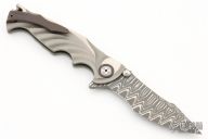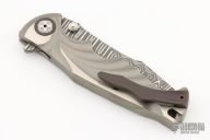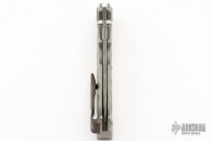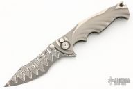 This Tighe Breaker Integral Flipper by Brian Tighe features a San-Mai Damascus blade with dual thumb studs, notched thumbrest and a flipper. The handle has a milled and bead blasted integral titanium frame with deep finger grooves, Zirconium pivot collars and tip up clip, lanyard hole at the butt. Smooth flipper action. Nice blade seating and lockup. Comes with zipper case. New from maker!